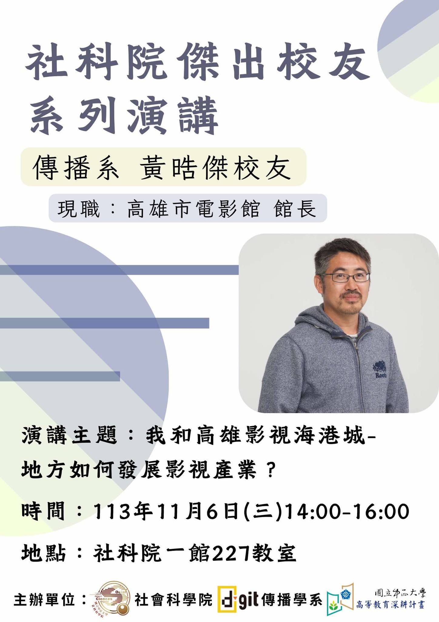 每一場策展的背後,都有一群重要的幕後推手,自2007年擔任「高雄電影節」策展人的黃皓傑,不僅是中正電傳所的傑出校友,也是現任的高雄電影館館長,這一週的演講,邀請他重返母校,與同學分享他與高雄的連結,以及如何在高雄這座影視海港城中,打造新興的電影基地。